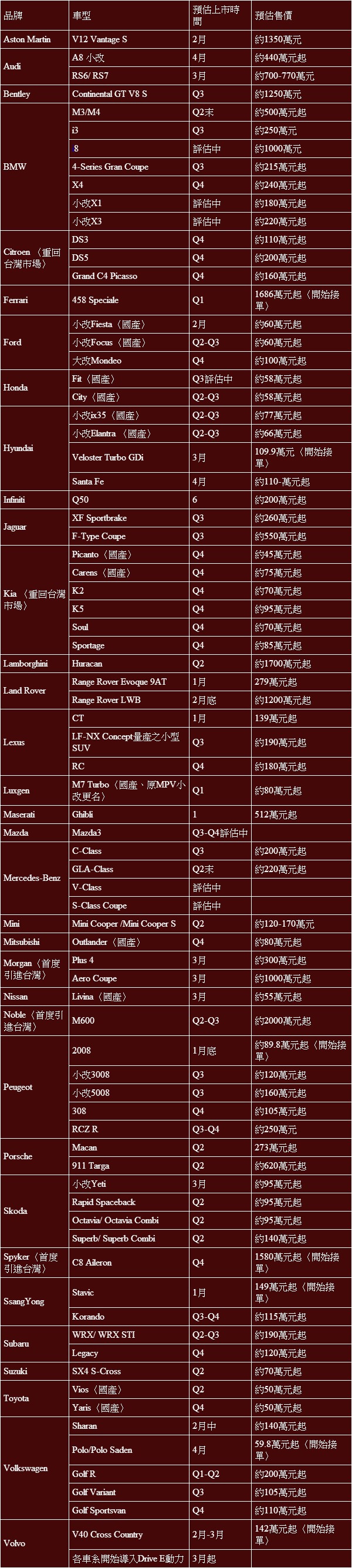 2014年台灣預計上市新車一覽表: